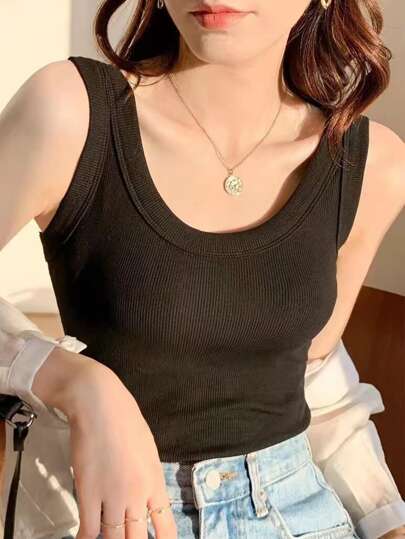1入組羅紋貼身吊帶背心上衣帶寬背帶適合女士,圓領透氣痕跡背心至套側胸部和防光 - 黑色 - 查看 1