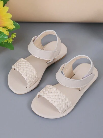 1 双大码女童米色平底凉鞋,PU 编织带露趾,圆头,防滑鞋底,舒适可爱的罗马风格凉鞋,适合 3-16 岁的婴儿、男孩、女孩,适合夏季日常、休闲、度假、派对穿着 - 米色 - 查看 1