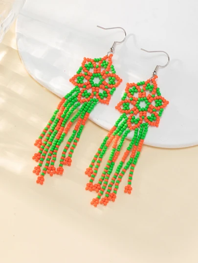 1對波希米亞風格明亮綠色和紫色金花玻璃珠流蘇耳環,適合女性日常佩戴 - 彩色 - 查看 1