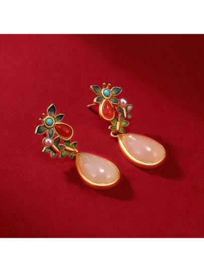 1對風女性復古搪瓷工藝鑲嵌人造和田玉和薔薇石蝴蝶耳釘,適合日常佩戴,完美搭配旗袍或旗袍裙 - 杏色 - 查看 1