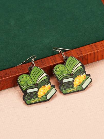 1對創意個性化綠色木製三葉草和書形耳環,適用於休閒服裝