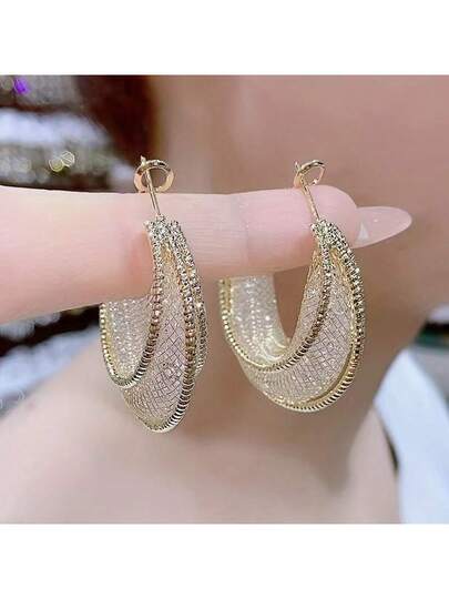 1對時尚奢華金線網&鑽石環耳環,具有獨特的設計感,適合女性日常佩戴 - 網鑽 - 查看 1