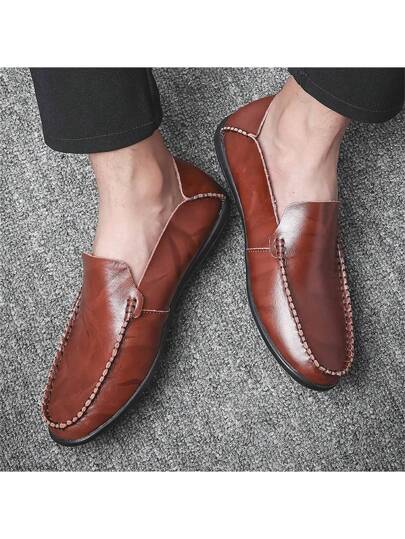 1雙男士滑入式防水防滑休閒皮鞋,圓頭平底鞋,軟底,適合戶外活動 - 棕色 - 查看 10