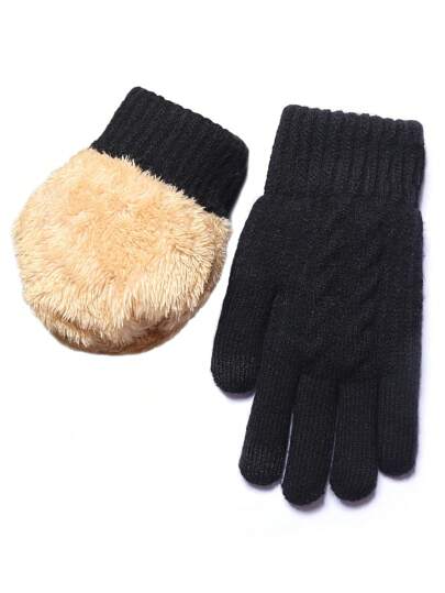 男士雙層加厚絨毛觸屏手套1對,鑽石圖案,針織款式,保暖,全手指,適合派對、開車、遊戲、騎自行車、遠足、筆記等場合 - 黑色 - 查看 1