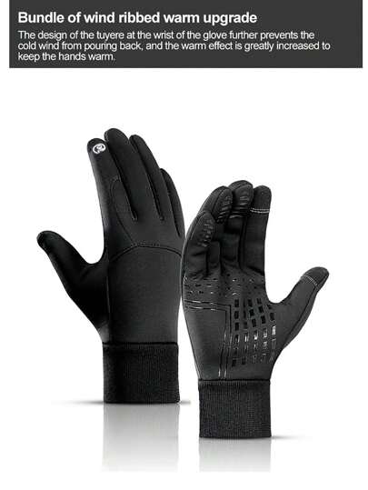 1 双户外冬季保暖羊毛触屏手套,带 PU 皮革拉链防水,男女摩托车骑行手套,黑色手套,冬季暖手器 - 黑色 - 查看 1