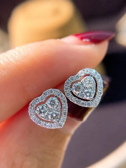 1對鑲有鋯石的純銀心形耳釘,時尚多用的女性奢華耳環 - 銀色 - 查看 1