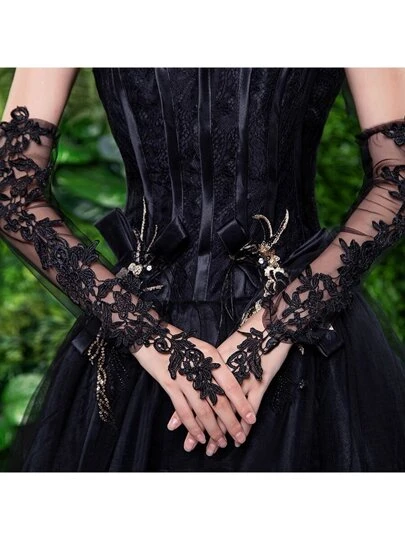Review: 黑色蕾絲,刺繡花朵透明長手套,別緻,中碼