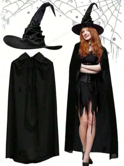 1 件/2 件万圣节斗篷套装、吸血鬼女巫服装、褶皱女巫帽、单层黑色死神斗篷、化妆舞会表演服 - 黑色 - 查看 1