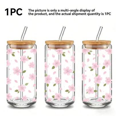 1个/5个装 16盎司樱花玻璃杯,带木盖和吸管,透明樱花冰咖啡杯,日常饮用泉水杯