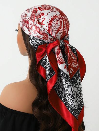 1条90厘米女士奢华印花方巾,时尚休闲涤纶围巾,四季皆宜的连衣裙头巾 - 紅加白 - 查看 4