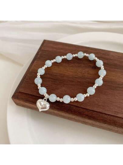 1條925純銀水晶珠寶石手鐲,女士高端可愛藍色心形魅力彈性手鍊