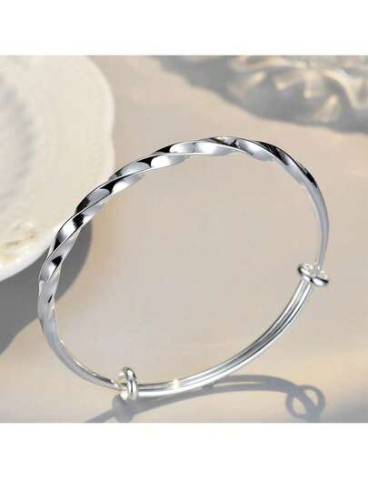 1 件可调节铜镀银扭曲光滑手镯,简约时尚,适合送给朋友、情人节的礼物 - 銀色1 - 查看 8