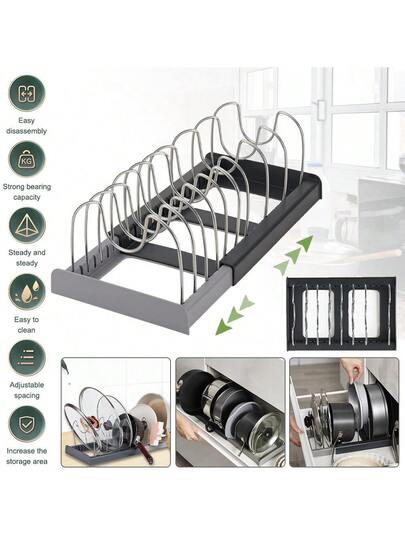 1pc Adjustable Expandable Pot And Pan Organizers Rack With Compartments, Kitchen Cabinet Pantry Bakeware Organizer Rack Holder For Pans And Pots Lid - 灰色 - 查看 1
