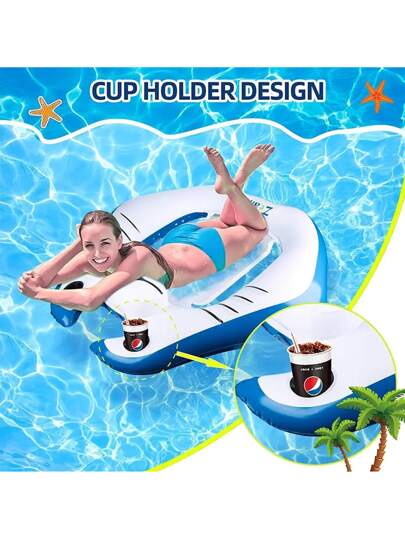 1入組成人充氣魟魚造型游泳池漂浮床,附有靠頭和杯架,夏天海灘、大型游泳池或派對休息艙必備 - 藍白色 - 查看 1