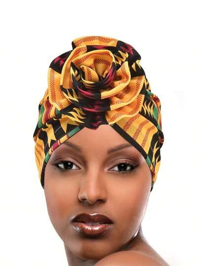 1 件非洲风格别致花卉印花头巾,波西米亚几何印花头巾,穆斯林头巾,皱纹弹力大花头带 - 彩色 - 查看 1