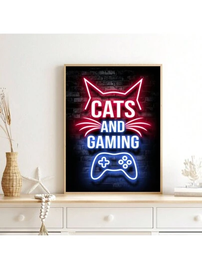 1張彩繪油畫霓虹貓和遊戲控制器海報,適用於遊戲室、臥室、辦公室、客廳、家居牆壁裝飾,不含畫框