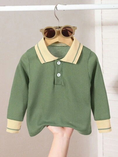 男婴长袖 Polo 衫,绿色纽扣半拉链套头衫休闲针织华夫格毛衣,春/秋 - 綠色 - 查看 1