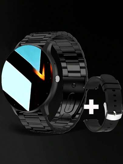 1入組黑色不銹鋼帶休閒心率檢測睡眠跟蹤卡路里計數器圓形錶盤智能手錶,與 iOS 兼容安卓