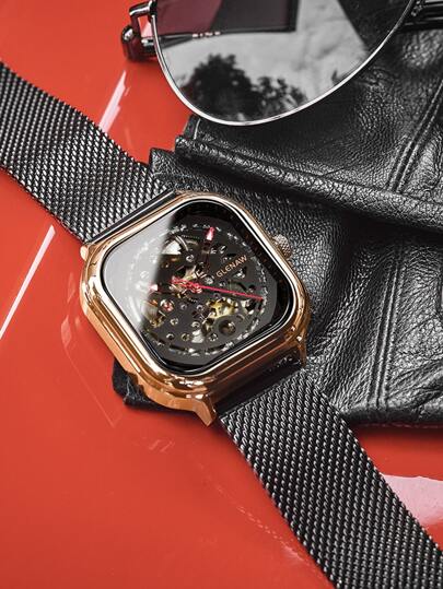 1入組黑色鋅合金帶休閒方形錶盤機械手表,適用於日常生活 - 金色 - 查看 1
