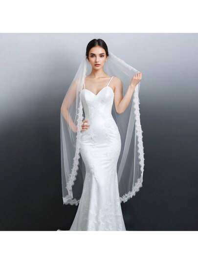 1件新娘婚纱中长款蕾丝边奢华白色复古新娘头纱配饰,适合拍照 - 彩色 - 查看 1