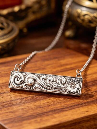 1件波西米亚风格浮雕花卉长吊坠项链,复古个性化颈链
