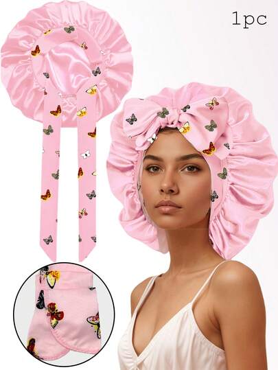 1件装蝴蝶结系带缎面睡帽,纯色弹力,轻便透气,适合女性和女孩,黑色。缎面睡帽,休闲舒适,日常佩戴和睡眠皆宜。