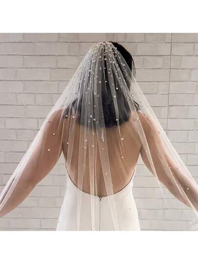 1 件新娘仿珍珠头纱复古拖尾头纱串珠婚礼摄影配饰 - 米色 - 查看 1