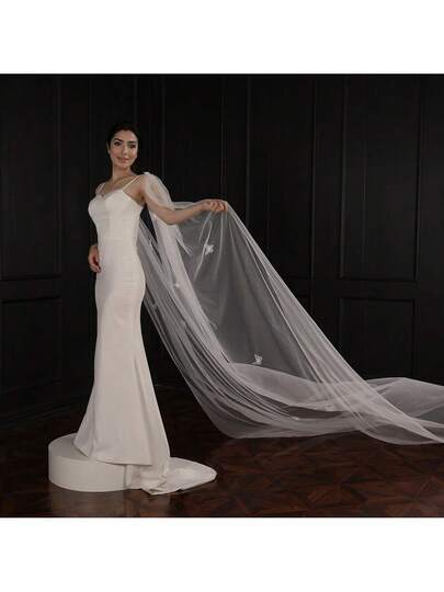一件式新娘婚纱,长款手工缝制蝴蝶装饰优雅教堂式拖尾婚纱,带披肩 - 彩色 - 查看 1