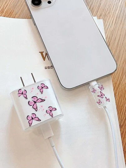 1入組蝴蝶圖案充電頭套和1入組數據綫保護頭 - 無色 - 查看 1