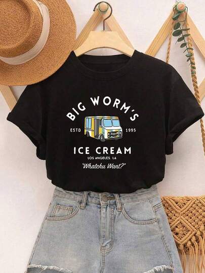 1 件汽车和字母印花涤纶女式 T 恤,适合海滩、夜间外出、运动、办公室、家居、街头、春季、夏季、秋季、冬季、男女通用情侣装 - 黑色 - 查看 1