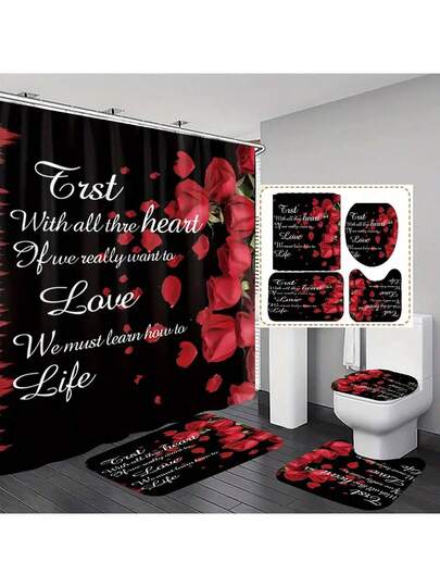 1入組卡通情人節主題淋浴簾,由聚酯纖維製成,並帶有12個掛鉤,防水聚酯纖維。另外還包括一個柔軟吸水防滑浴室墊,適用於家用 - 紅色 - 查看 1