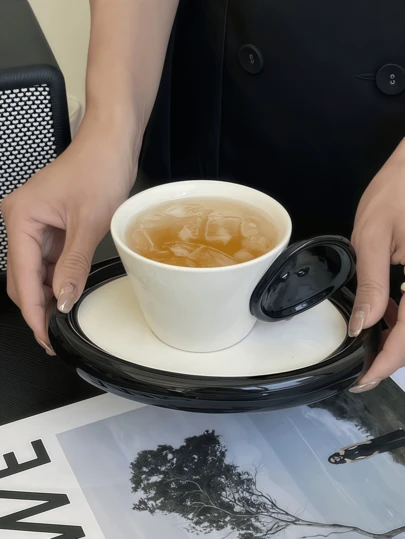 1 件陶瓷纽扣设计马克杯带盘子,INS 风格纽扣杯碟套装,适合餐厅、客厅、咖啡厅派对的高品质餐具 - 黑與白 - 查看 1