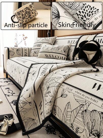 1件装雪尼尔植物迎宾沙发套法式浪漫简约宠物友好防滑耐脏四季可用沙发垫 - 黑與白 - 查看 1