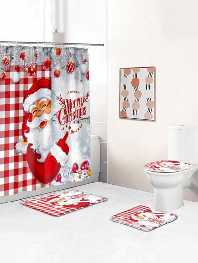 1 件圣诞格子圣诞老人印花涤纶防水隔热家居装饰浴室浴帘或 4 件浴室防滑垫套装,厚度 1.3 厘米,包括浴室浴帘和垫子家居浴室装饰夏季浴室配件返校 - 彩色 - 查看 1