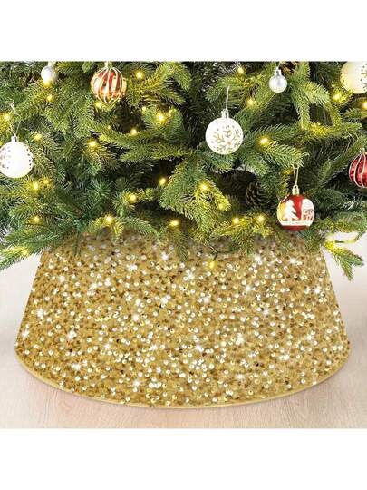 1 件圣诞树裙,3D 亮片树裙装饰,圣诞派对家居装饰,圣诞树底盖,闪亮厚实的金色、红色、银色裙子,自粘式,方便存放 - 金色 - 查看 1