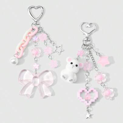 1件创意甜美女孩休闲可爱白色仿珍珠仿水晶圆珠粉色树脂亚克力半透明樱花链蝴蝶结闪光镂空星星像素爱心毛绒3D卡通泰迪熊钥匙扣包挂件,适合女性、女孩、姐妹、闺蜜、日常佩戴、节日礼物