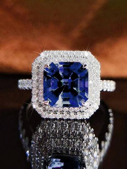 1枚镶嵌立方氧化锆的女士戒指,情人节、母亲节或送给妈妈的礼物 - 藍色 - 查看 1
