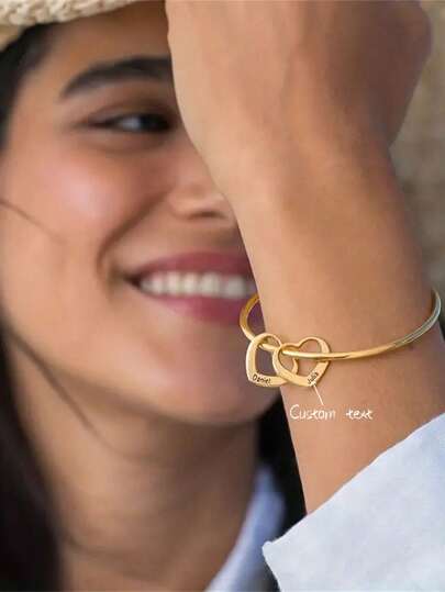 1 件定制不锈钢雕刻名字女士手链个性化心形吊饰情侣手链送女友节日礼物 - 銀色 - 查看 1