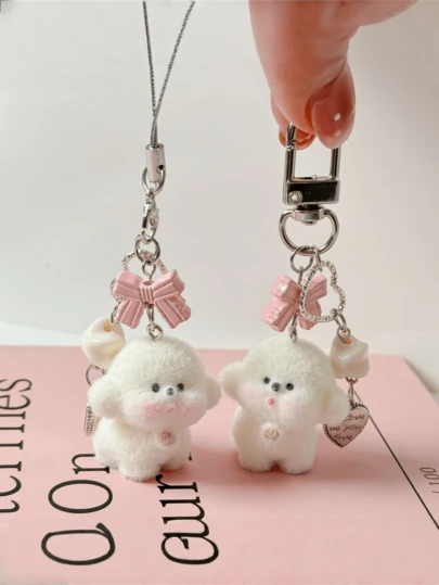 1 件可爱植绒熊手机挂饰、少女蝴蝶结卡通动物包包吊坠配饰、钥匙扣