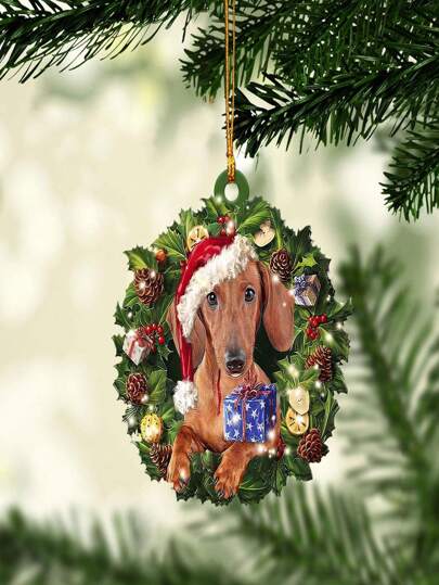 1入組腊肠犬帶聖誕帽和花圈裝飾掛飾,適用於汽車、聖誕樹、家庭裝飾 - 彩色 - 查看 1
