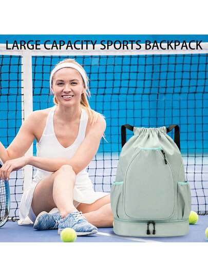 1 件带羽毛球网球拍口袋的抽绳背包,大容量便携式球拍携带包,用于匹克球,干湿分离游泳瑜伽健身包,带鞋隔层,耐磨多口袋运动包,防水行李袋,返校多功能手提包,适用于女性和男性户外足球篮球旅行徒步旅行骑自行车健身单肩包 - 彩色 - 查看 1