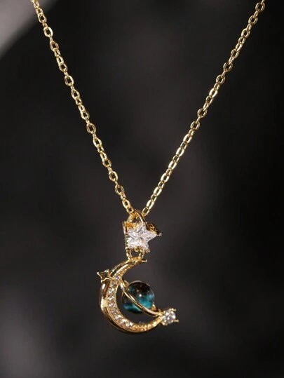 1入夢幻星球主題的金色項鍊,帶有月球和地球吊墜,適合女性日常佩戴 - 金黃色 - 查看 1