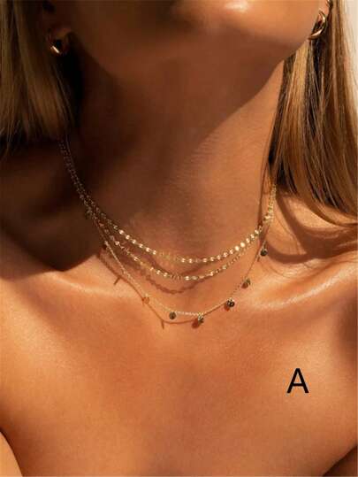 1 件优雅时尚细链项链,带方晶锆石圆形吊坠,多层女士项链,适合日常、派对、约会 - 金黃色 - 查看 1