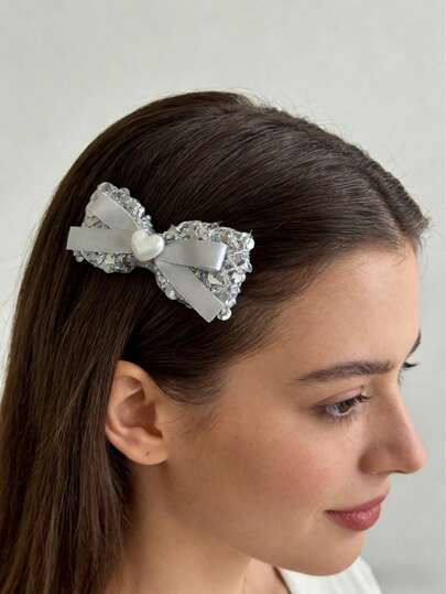 1个优雅银色亮片发夹,闪亮心形蝴蝶结发夹,侧刘海夹,适合日常佩戴