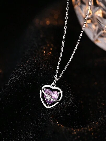 1個精美的女士首飾s925純銀粉紅鑽石心形中空項鍊,豪華逐漸透亮水晶鑽石鎖骨鏈 - 銀色 - 查看 1