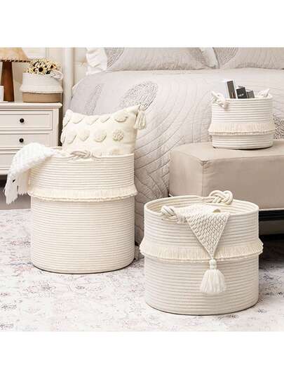 1 件超大编织储物篮,手工编织,带有可爱的流苏装饰,装饰篮,洗衣篮,适合存放杂志、玩具、毯子和衣服、婴儿房装饰 - 家用储物容器。 - 白色 - 查看 1