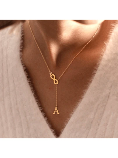 1 件时尚不锈钢字母和无限扣吊坠链项链女士 - 金黃色 - 查看 1