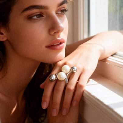 1 件时尚夸张可调节珍珠钻石花戒指 - WR936白色 - 查看 2