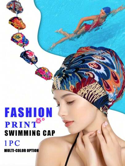 1顶时尚印花弹力褶皱防水泳帽,沙滩泳池必备泳帽,适合短发和中长发