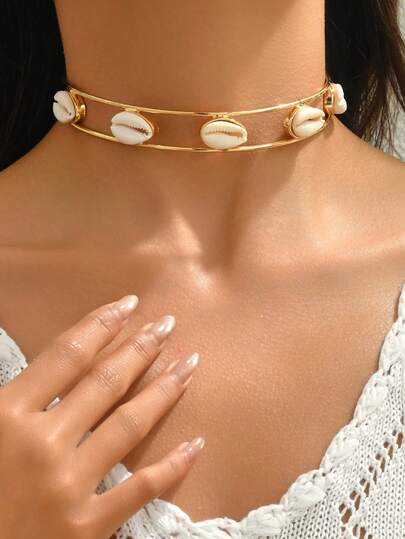 1 件时尚简约海洋风格双线贝壳镶嵌项链,夏季海滩度假音乐节街头摄影派对配饰 - 白色 - 查看 1